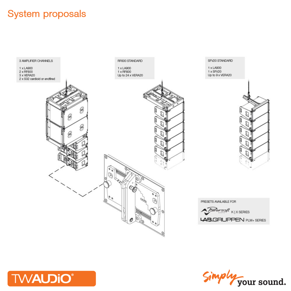 VERA20 este echipata cu două difuzoare de 10 pentru frecvențele joase-medii și un ghid de undă nou dezvoltat cu un driver de compresie de 1,4 mediu-înalt. Măsurând doar 60 cm în lățime, difuzorul face parte dintr-o matrice verticală de până la 24 de elemente.